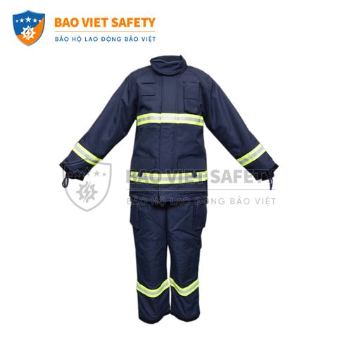 Quần áo chống cháy thường được may từ vải cotton 100% xử lý Proban hoặc Nomex (DuPont), đạt chuẩn EN 11611/EN 11612 (chống cháy lan, chịu tàn lửa 30–60 giây). Bộ gồm áo dài tay + quần dài hoặc jumpsuit kín toàn thân, có cổ cao, khóa kéo chịu nhiệt và túi đa năng kín nắp. Dải phản quang bạc 5 cm bao phủ vai, ngực, eo, tay áo giúp tăng nhận diện ban đêm. Lớp lót cotton thoáng khí giảm nóng ẩm, trọng lượng bộ khoảng 2–3 kg, thoải mái di chuyển. Một số mẫu cao cấp có lớp cách nhiệt aluminized chịu nhiệt bức xạ lên đến 1.000°C.